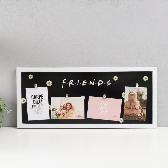 Фоторамка пластик на 4 фото 10х15 см "Друзья. Ромашки на чёрном" с прищепками белая 64х27 см 97138