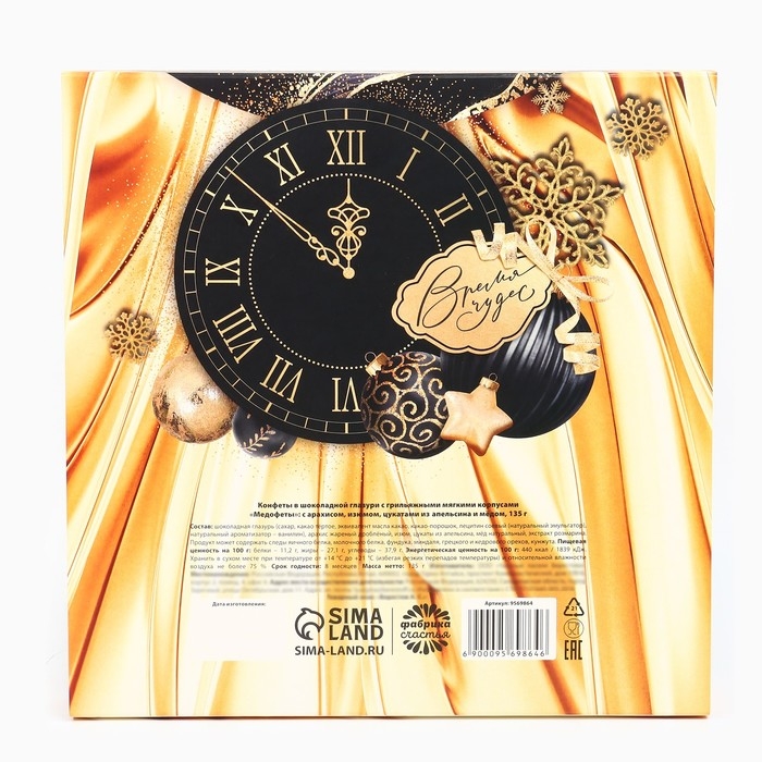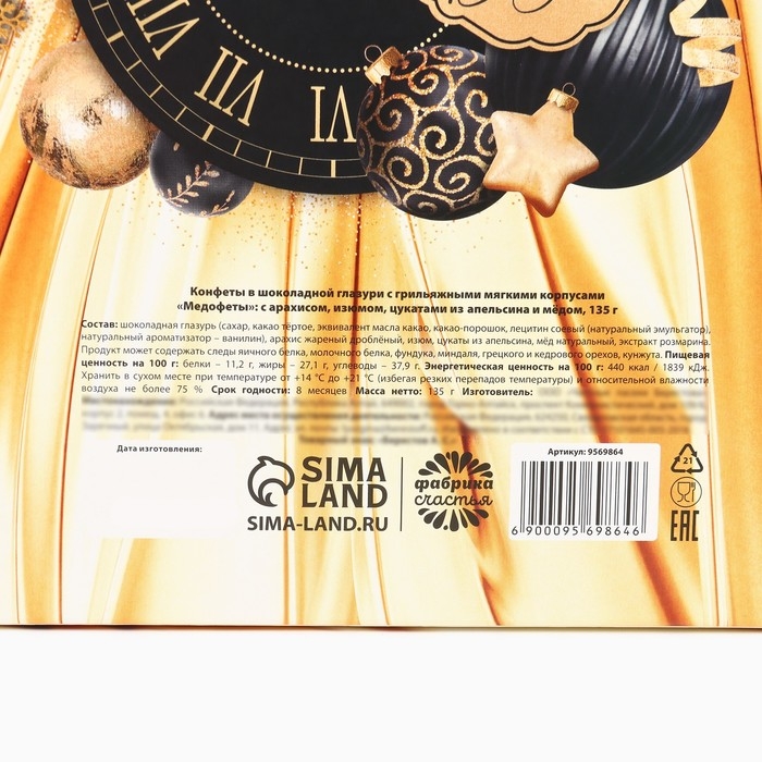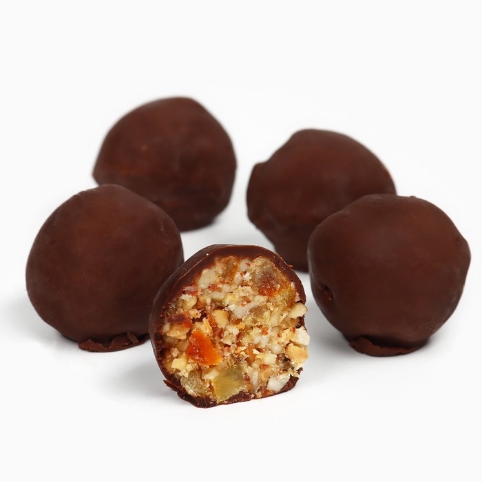 Состав: шоколадная глазурь (сахар, какао тёртое, эквивалент масла какао, какао-порошок, лецитин соевый (натуральный эмульгатор), натуральный ароматизатор – ванилин), арахис жареный дроблёный, изюм, цукаты апельсина, мёд натуральный, экстракт розмарина. Продукт может содержать следы яичного белка, молочного белка, фундука, миндаля, грецкого и кедрового орехов, кунжута.