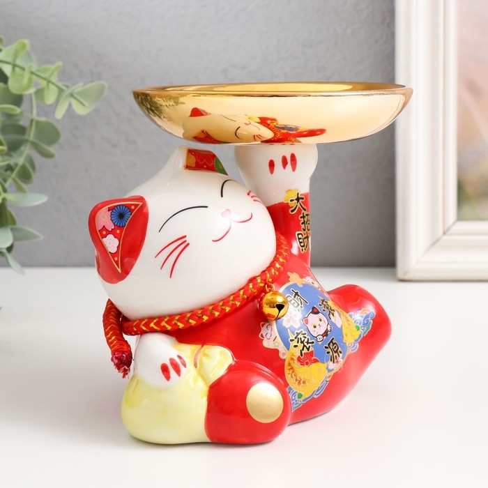 Копилка керамика "Кот Манэки-нэко для привлечения богатства с тарелкой" 11,5х15,5х13 см