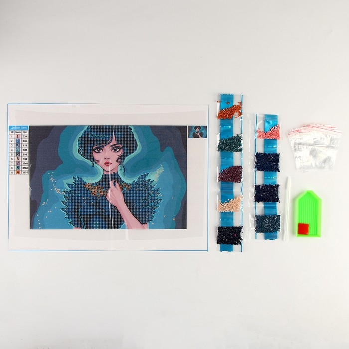Разложите стразы с помощью карандаша по указанной схеме, заполнив полотно. Тканевая основа с точечным клеевым покрытием будет надёжно удерживать стразы. На картине уже обозначены необходимые оттенки, а цветовая таблица расположена рядом с рабочей областью холста.