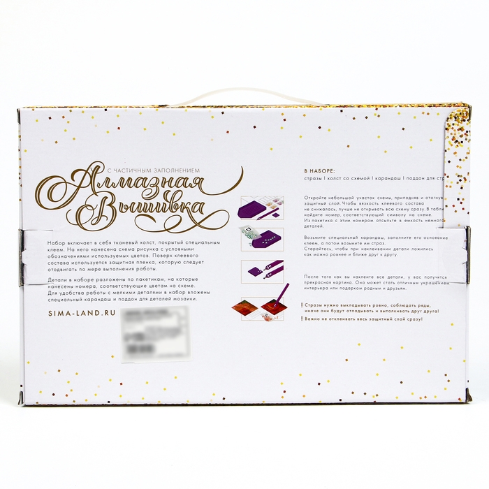 Часть изображения предстоит заполнить стразами, другая часть напечатана на холсте-основе. Поэтому набор подойдёт для тех, кто впервые пробует свои силы в этой технике или любит быстро добиваться результата.