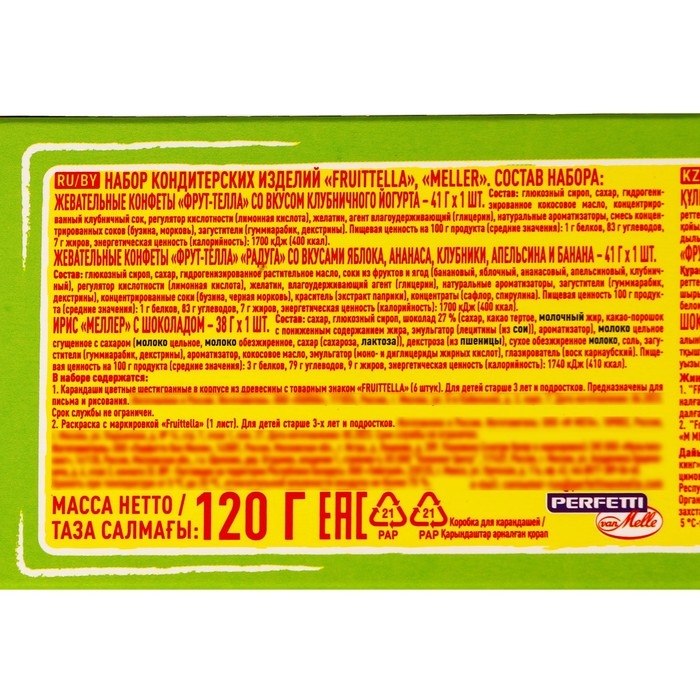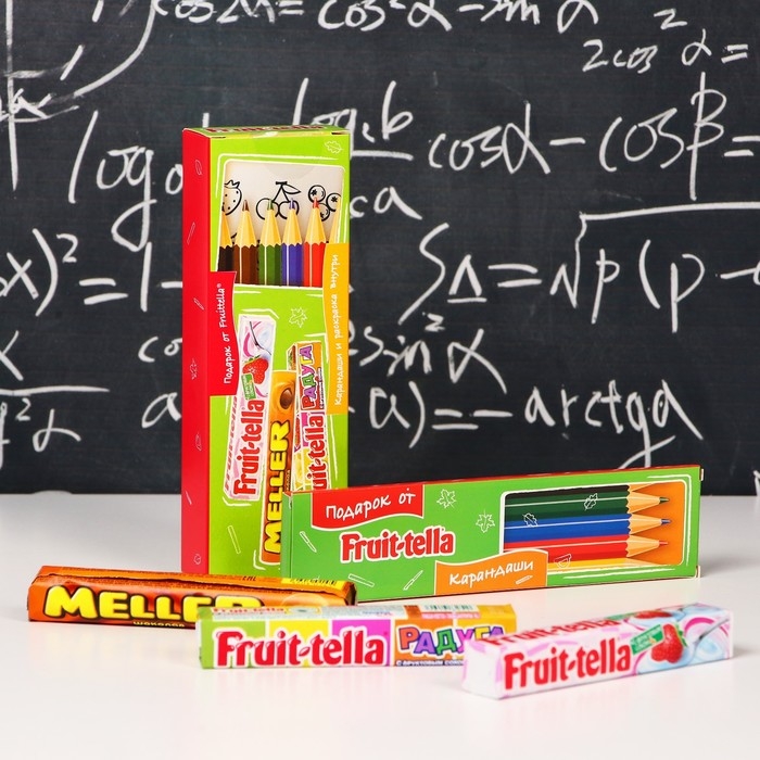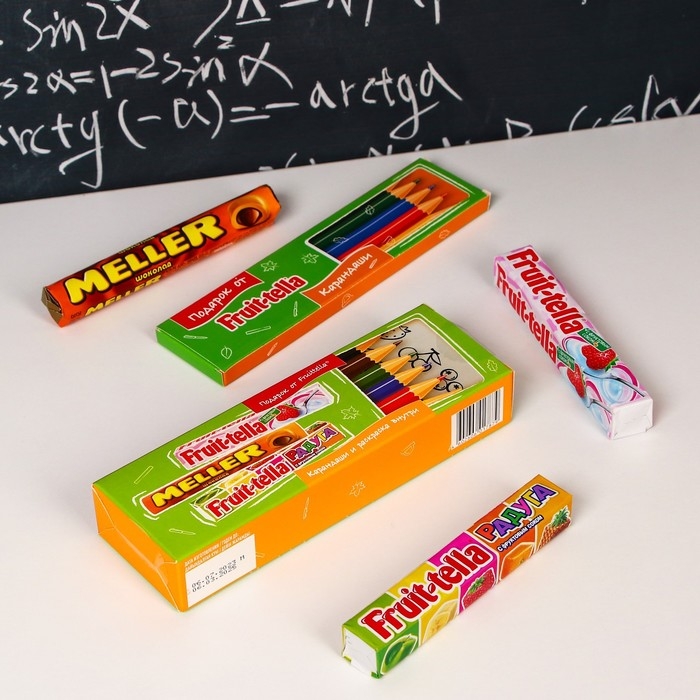 Набор сладостей Карандаши - это микс популярных сладостей от брендов Fruittella и Meller в необычной упаковке в форме пенала для карандашей. В наборе вы сможете найти жевательные конфеты и жевательный ирис. А ещё внутри вас ожидает дополнительный подарок от Fruittella - карандаши и раскраска. Прекрасный подарок, если вы любите конфеты и творчество.