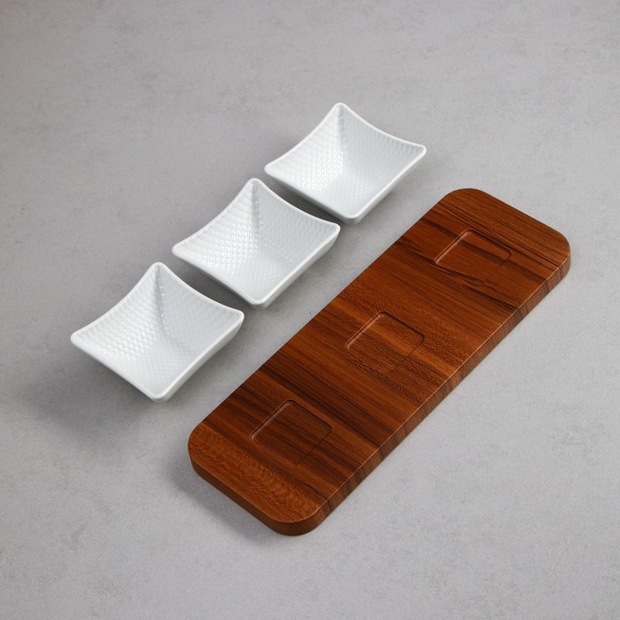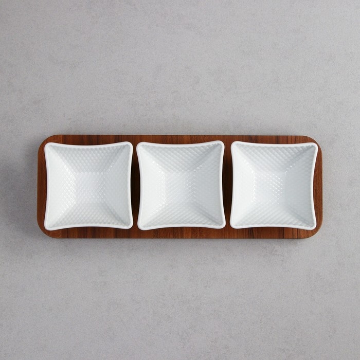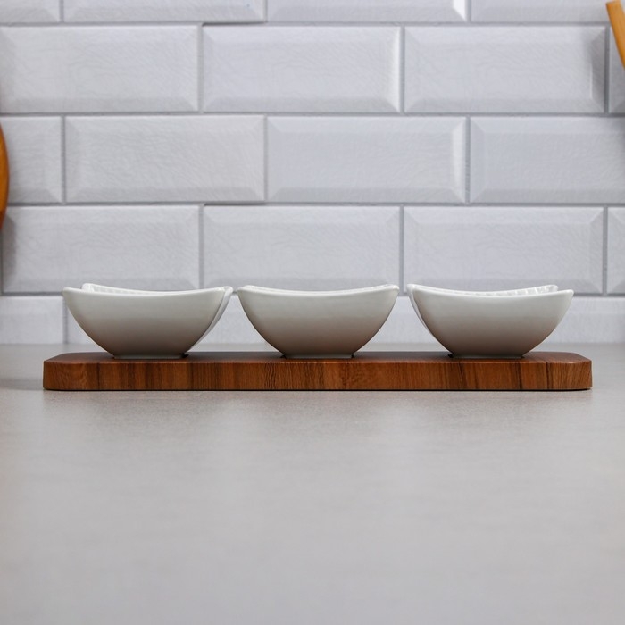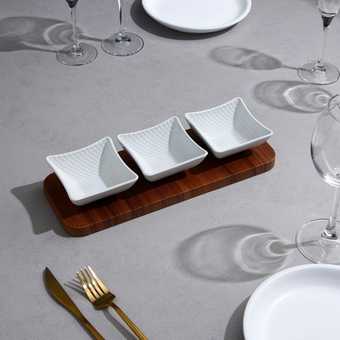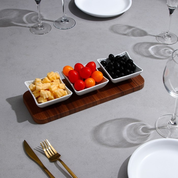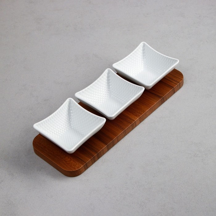 Менажница на деревянном основании — это эстетика стиля и удобство сервировки на вашем столе. Разлейте по мискам соусы, заправки или насыпьте специи, подайте на стол к мясным блюдам. Любите домашние чаепития? Используйте фарфоровые емкости для варенья, меда и конфет. Решили провести приятный вечер с бокалом вина? Менажница отлично подходит для сыра, орехов и других закусок. Необычная подача блюд не оставит равнодушными ваших гостей и домочадцев. Утонченный дизайн позволяет набору вписаться в любой интерьер, он везде будет к месту.