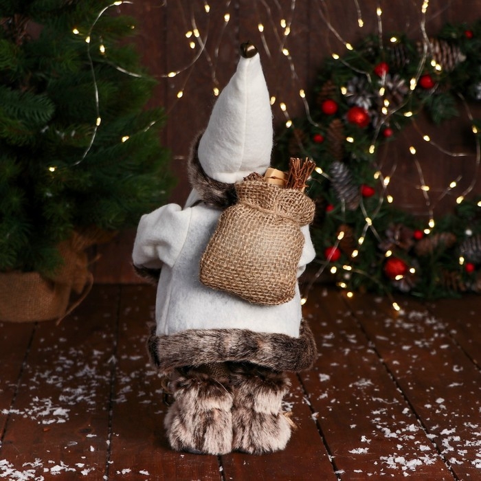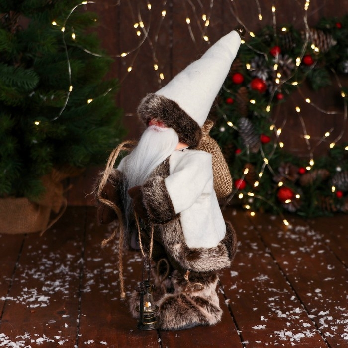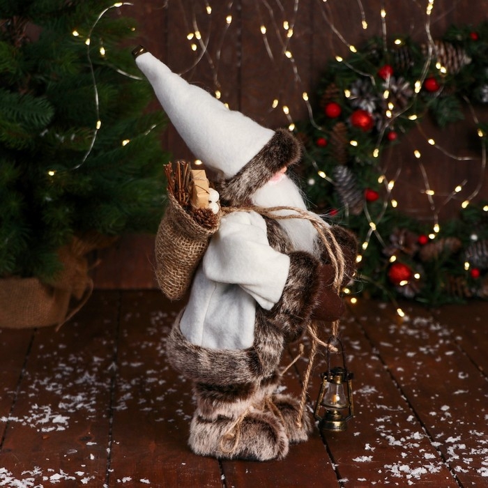 Дед Мороз "В клетчатом жилете, с фонариком" 28 см, серо-белый