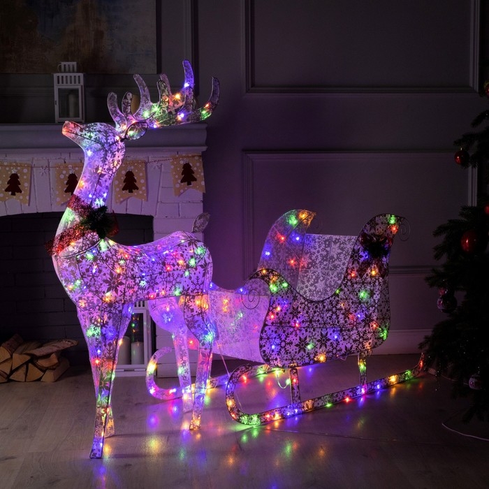Светодиодная фигура «Олень с санями», олень: 65 × 123 × 25 см, сани: 110 × 55 × 45 см, металл, текстиль, 220 В, свечение мульти