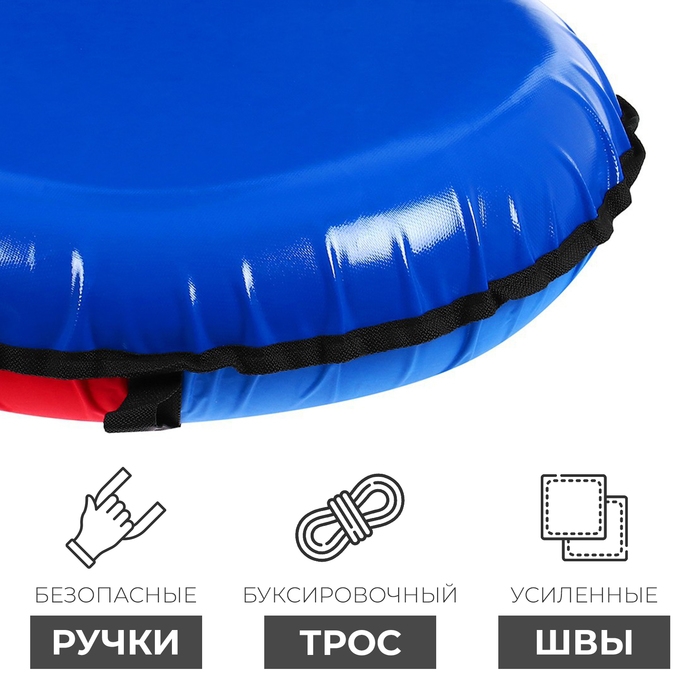 Тюбинг оснащён безопасными ручками. Его материал прослужит долго и обеспечит отличное скольжение. Фактический размер накачанного тюбинга зависит от температуры внешней среды и давления в камере.