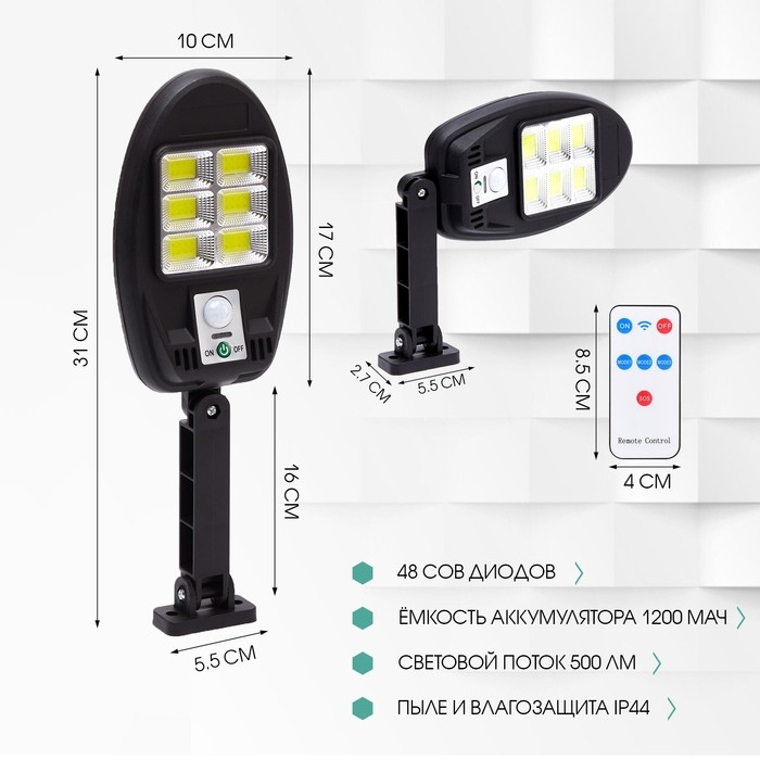 Фонарь настенный аккумуляторный с солнечной батареей — это беспроводное осветительное устройство, которое накапливает энергию днем от солнечной панели. Уличный настенный светодиодный фонарь на аккумуляторе с зарядкой от солнечной панели. Фонарь оснащен 48 яркими светодиодами COB, которые обеспечивают световой поток яркостью 500 Люмен. Размеры солнечной панели составляют 10.7 x 5.2 см, а размеры самого фонаря - 31 x 10 x 5.5 см. Аккумулятор фонаря имеет емкость 1200 мАч. В комплекте с фонарем поставляется пульт дистанционного управления, позволяющий выбирать различные режимы освещения. Корпус фонаря выполнен из прочного ABS-пластика. Поставляется в картонной коробке.