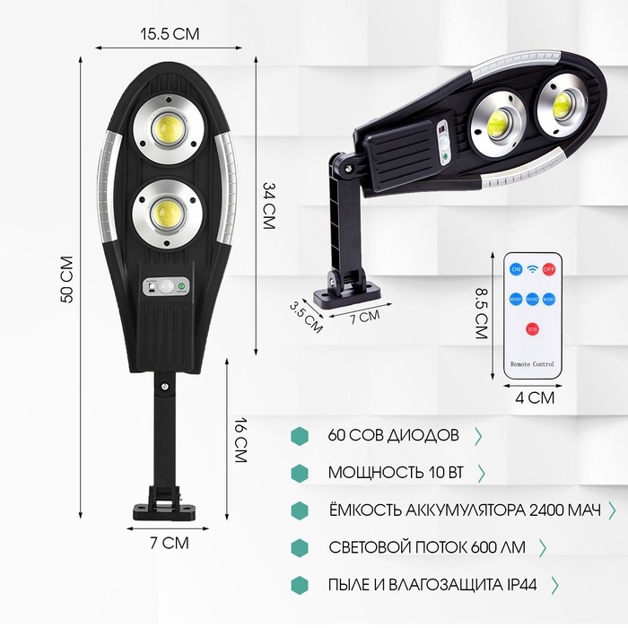 Фонарь настенный аккумуляторный с солнечной батареей — это беспроводное осветительное устройство, которое накапливает энергию днем от солнечной панели. Уличный настенный поворотный фонарь с возможностью регулировки угла освещения, корпус которого выполнен из ABS-пластика. Работает от аккумуляторной батареи, входящей в комплект. Имеет два светодиода COB для яркого и равномерного освещения. Размеры фонаря с креплением составляют 50 x 15.5 x 7 см. Корпус изготовлен из прочного и долговечного ABS-пластика. Мощность фонаря - 10 Вт, яркость освещения - 600 люмен. Аккумуляторная батарея имеет емкость 2400 мАч, обеспечивая длительное время работы без подзарядки. Пульт дистанционного управления входит в комплект поставки. Товар поставляется в надежной картонной коробке.