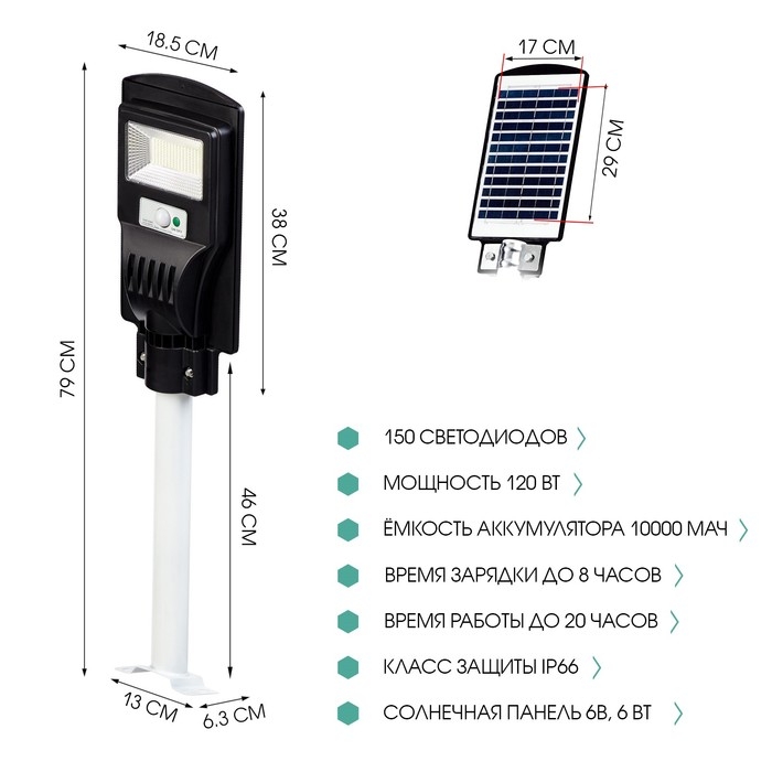 Уличный настенный фонарь, изготовленный из ABS-пластика, идеально подходит для освещения больших площадей до 150 квадратных метров. Он работает от встроенного аккумулятора большой емкости (10 000 мАч). Комплектация включает пульт дистанционного управления, крепежные винты и фонарную трубу для установки на нужной высоте. Мощный (120 Ватт) фонарь оснащен 150 светодиодами SMD LED 2835, обеспечивающими яркий и равномерный световой поток. Время зарядки от 5 до 8 часов обеспечивает до 15-20 часов работы без подзарядки, а солнечная панель с напряжением до 6 В, и мощностью 6 Вт обеспечивает зарядку от солнечной энергии в течение дня. Поставляется в надежной коробке для безопасной транспортировки и хранения. С помощью пульта дистанционного управления можно регулировать яркость, что делает использование фонаря еще более удобным и функциональным.
