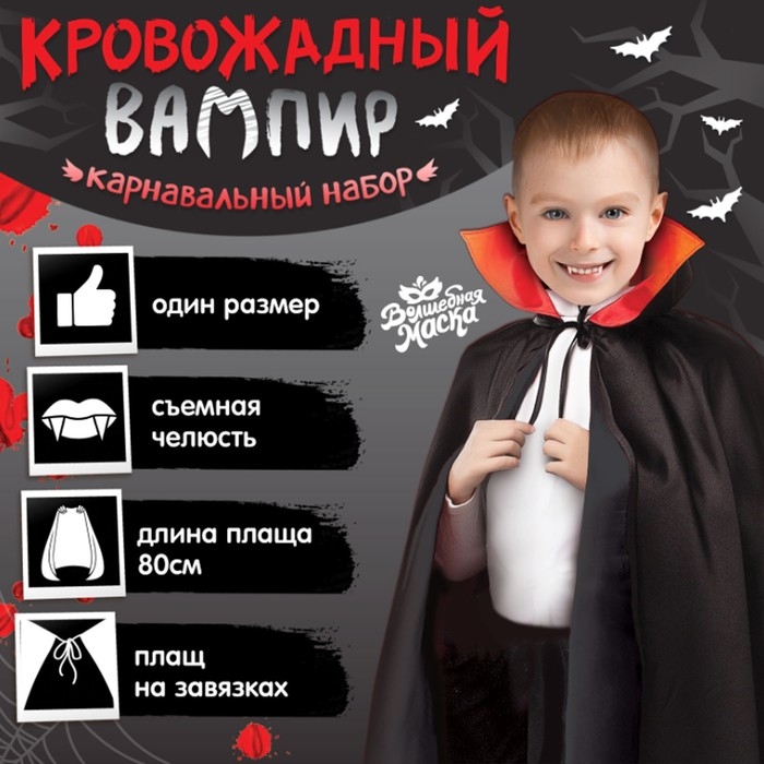 С набором «Кровожадный вампир» ваш малыш станет настоящей звездой на тематической вечеринке и поразите всех гостей! С ним вы составите полноценный образ, ведь в комплекте есть плащ и челюсть вампира. Создавайте яркие эмоции и воспоминания на целый год вперёд себе и ребёнку!