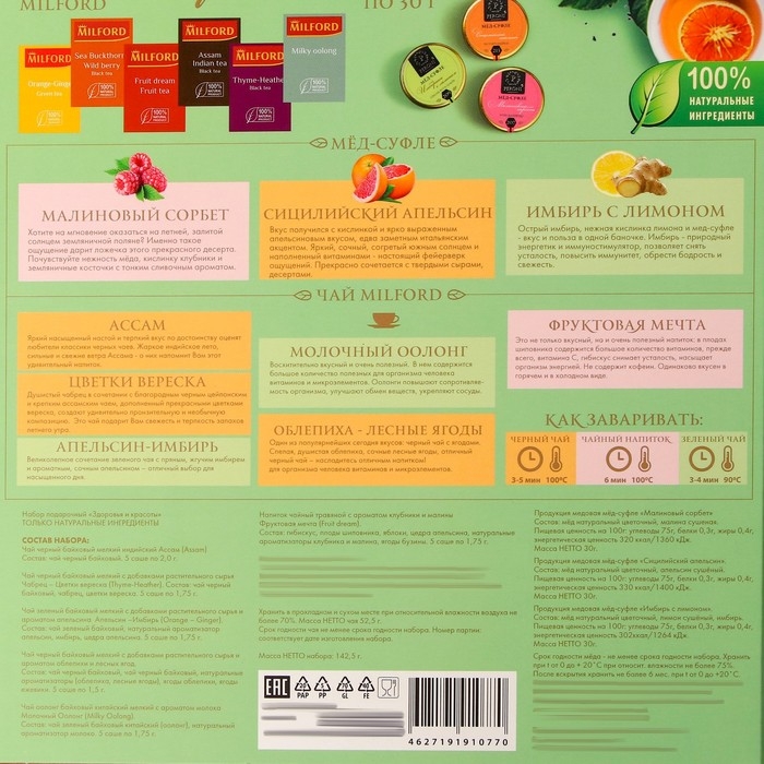 Крем-мед Peroni - это 100% настоящий эко-продукт, изготовленный с любовью и заботой, пыльца и нектар собранный пчелами на пасеках с экологически чистых полей и пчелиных фермерский угодий. Набор "Здоровья и Счастья" - 3 баночки мед суфле по 30 г с ассорти чая в пакетиках (6 вкусов * 5 пак.), уложенные в стильную подарочную упаковку премиум качества. Состав крем меда натуральный, без искусственных добавок, красителей и консервантов, ведь мед - отличный консервант, а орехи, сок фруктов и сублимированные ягоды придают ему приятный нежный цвет.