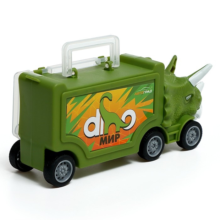 Грузовик «Дино-перевозчик» готов доставить машинки для скоростных соревнований в любое время и в любое место. Загрузите машины в кузов автомобиля и начинайте игру. С ярким транспортом в виде динозавров игровым сюжетам мальчишки не будет предела. Ребёнок устроит настоящие гонки и будет состязаться с друзьями в быстрой и манёвренной езде.