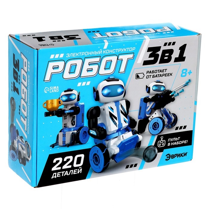 Электронный конструктор «Робот» — набор для сборки одной из трёх моделей: доставщика, снайпера или футболиста. Каждый робот выполняет своё уникальное действие!