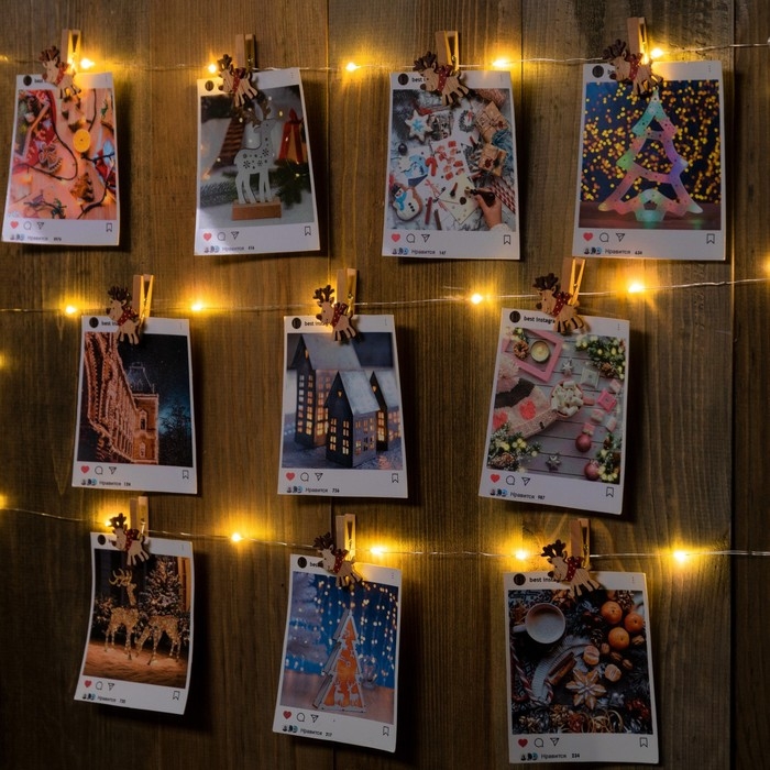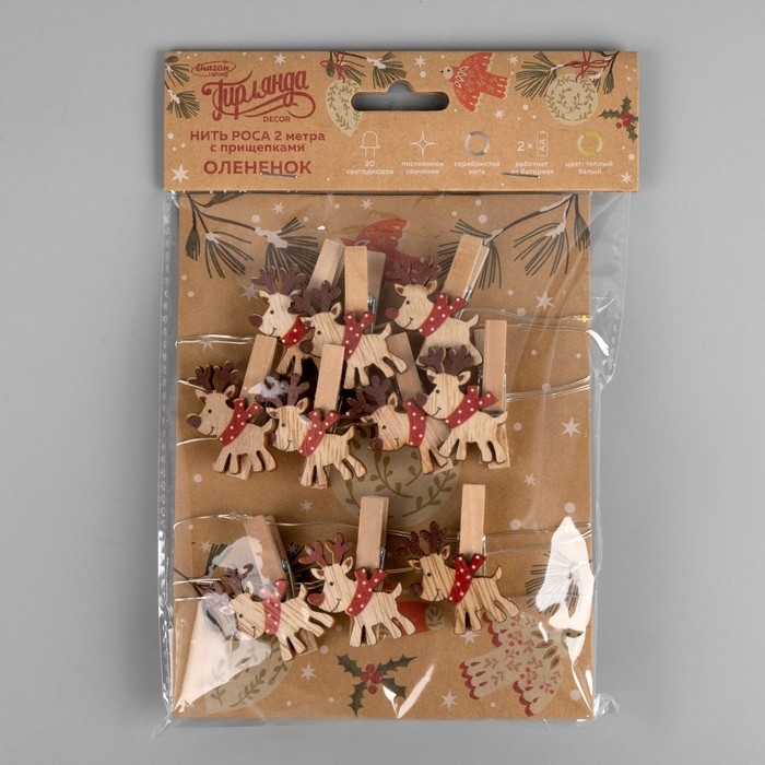 Гирлянда «Нить» 2 м роса с насадками «Прищепки-оленёнок», IP20, серебристая нить, 20 LED, батарейка ААх2 (нет в комплекте), свечение тёплое белое