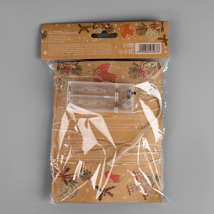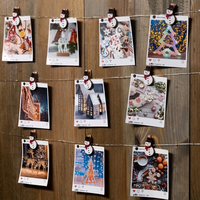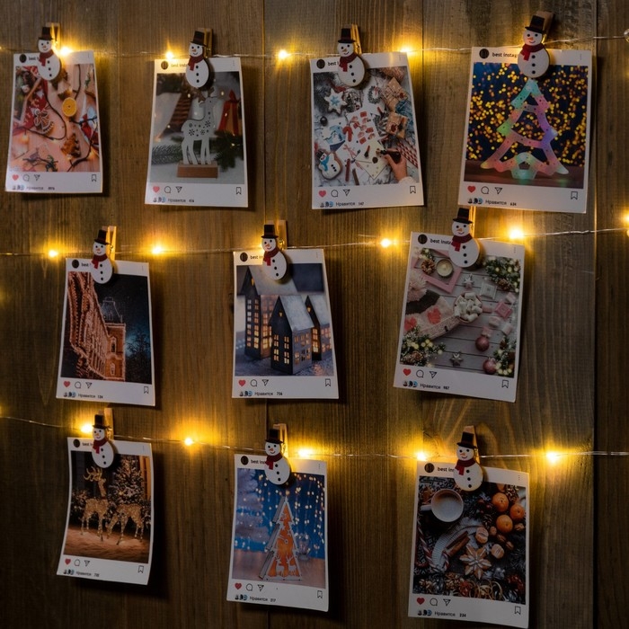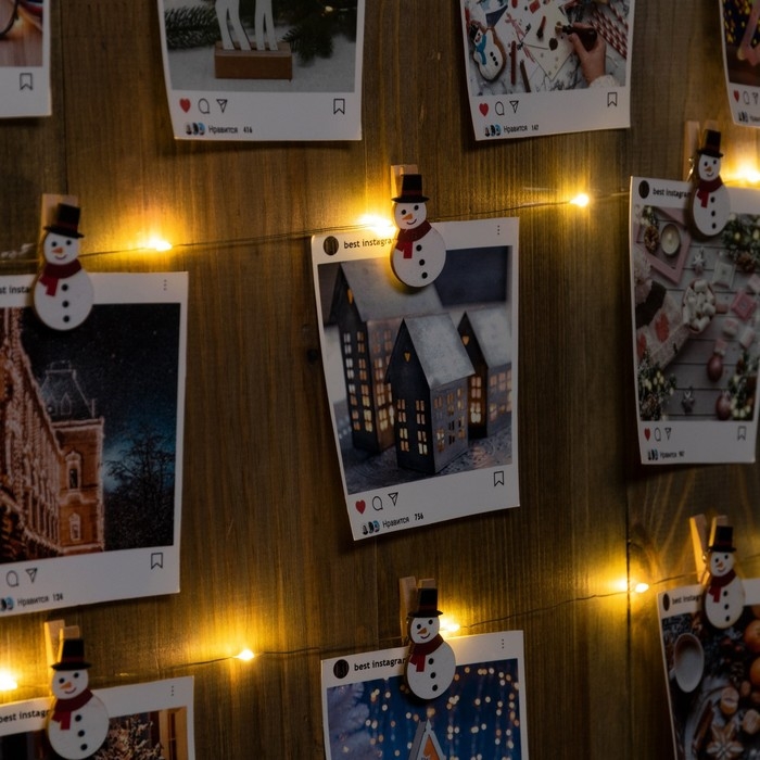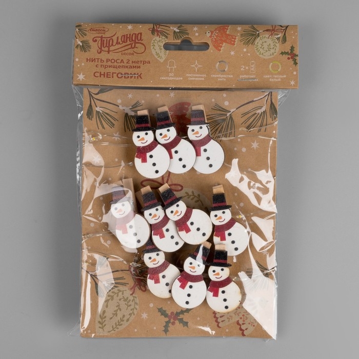 Гирлянда «Нить» 2 м роса с насадками «Прищепка-снеговик», IP20, серебристая нить, 20 LED, батарейки ААх2 (нет в комплекте), свечение тёплое белое