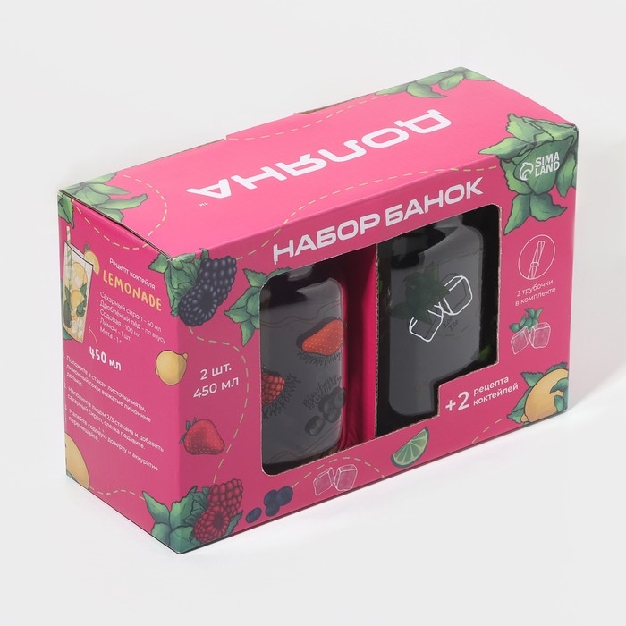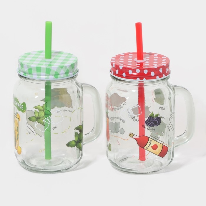 Набор кружек стеклянных Доляна «Яркий лимонад», 2 предмета: 2 кружки с крышками и трубочками 450 мл