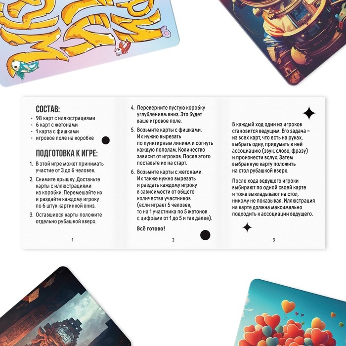 Каждый ход один из игроков становится ведущим. Задача ведущего: из шести карт, которые есть у него на руках, выбрать одну (самую вдохновляющую), придумать к ней ассоциацию и произнести её вслух. Ассоциация может быть любая: звук, слово, фраза, название фильма, отрывок из стихотворения — ограничений нет! Выбранную карту нужно положить на стол картинкой вниз, чтобы никто не видел, что на ней изображено.