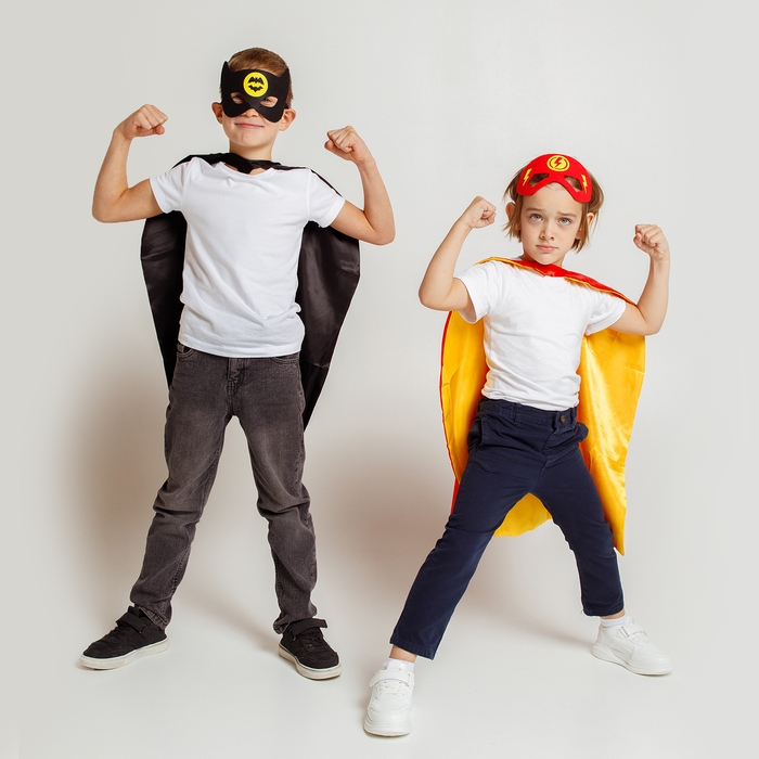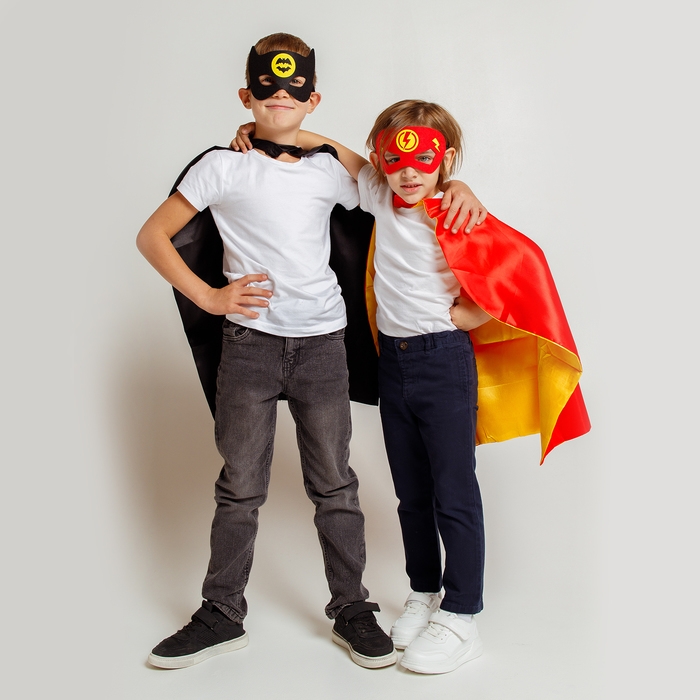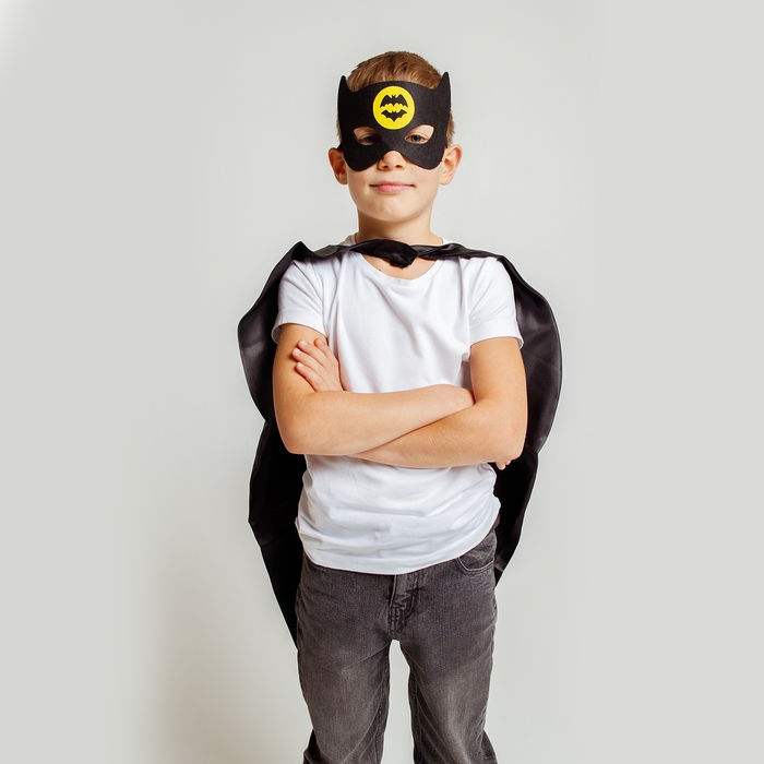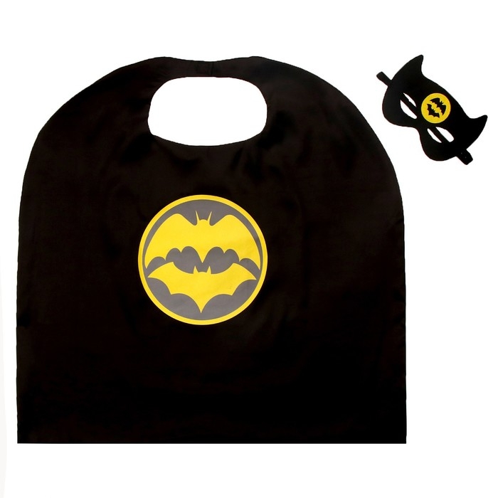 - Маску и плащ украшает стилизованное изображение летучей мыши, которое добавляет образу таинственности
