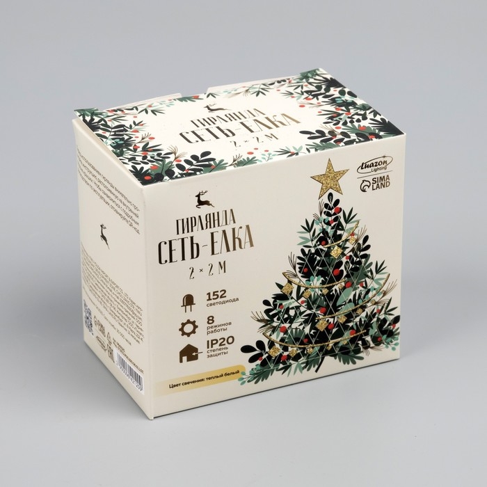 Гирлянда «Сеть-ёлка» 2 × 2 м, IP20, тёмная нить, 152 LED, свечение тёплое белое, 8 режимов, 220 В