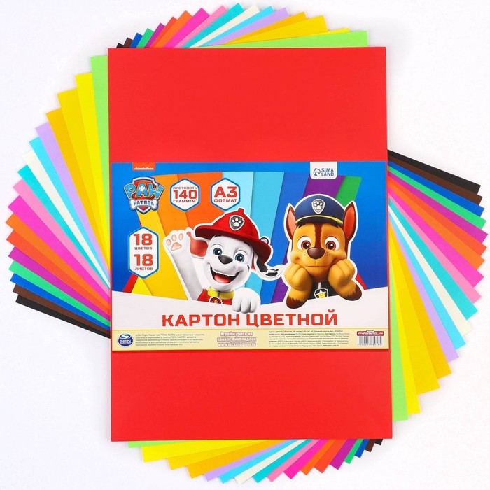 Картон цветной тонированный, А3, 18 листов, 18 цветов, немелованный, двусторонний, в пакете, 140 г/м², Щенячий патруль