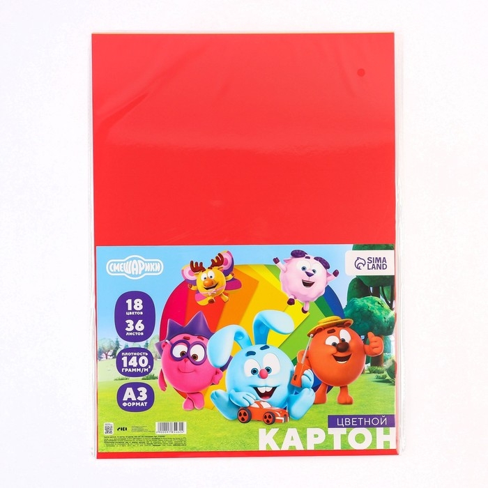 Картон цветной тонированный, А3, 36 листов, 18 цветов, немелованный, двусторонний, в пакете, 140 г/м², Смешарики