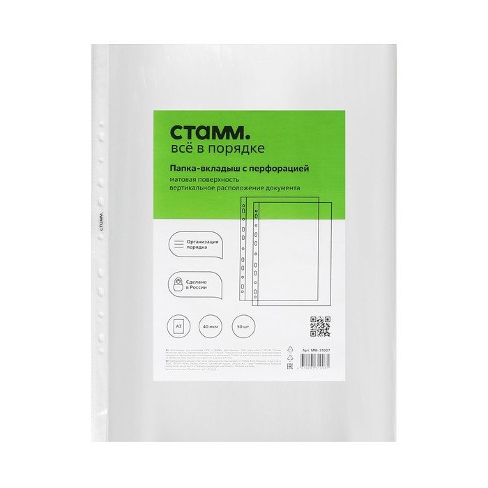 Файл-вкладыш А3, 40 мкм, Стамм, матовый, вертикальный, 50 штук