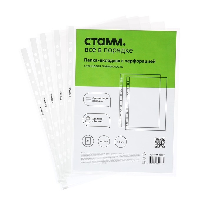 Папка-вкладыш с перфорацией «СТАММ» отлично подойдет хранения и систематизации документов. Папка размером 310 х 240 мм изготовлена из полипропилена толщиной 110 мкм. Папка вмещает до 50 листов. Имеет глянцевую текстуру, защищает листы от внешних воздействий. Перфорация на боковой части позволяет разместить изделие в папке с любым кольцевым механизмом или скоросшивателе. Упакованы в пакет по 50 штук.