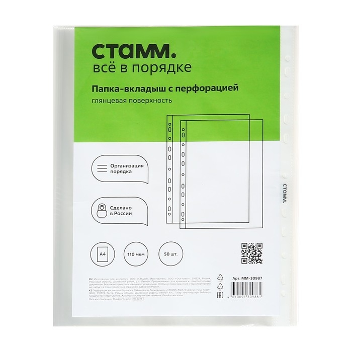 Файл-вкладыш А4, 110 мкм, СТАММ, глянцевый, вертикальный, 50 штук