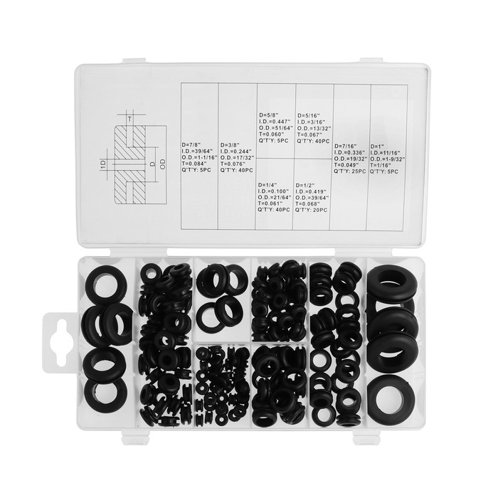 Набор резиновых втулок, 8 видов, 180 шт. Набор резиновых втулок 180 шт , используется для прокладки электропроводки, уплотнения магистралей и топливопроводов в местах соприкосновения с металлическими деталями кузова. Можно использовать в автосервисе и на станции технического обслуживания при ремонте системы кондиционирования автомобиля, а также во время других ремонтно-монтажных работ, например, сантехнических (для смесителей, фитингов и прочего). Втулки изготовлены из высококачественной резины, стойкой к перепадам температур и механическому износу. Набор предоставляется в пластмассовом боксе, разделенном на сектора и содержит 180 уплотнительных элементов.