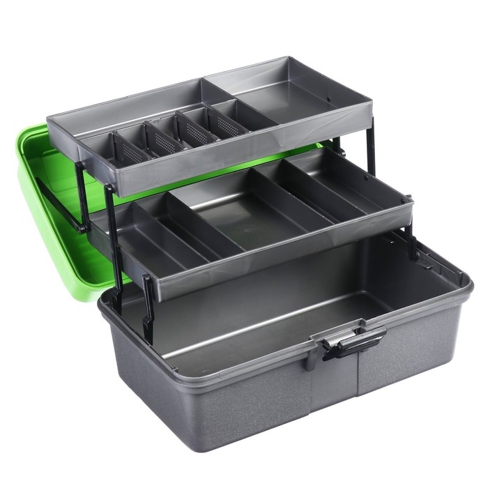 Удобный и вместительный ящик с двумя выдвижными полками для различной рыболовной оснастки: поплавков, приманок и другой полезной мелочи. На дно ящика можно положить 1-3 спиннинговых катушек.