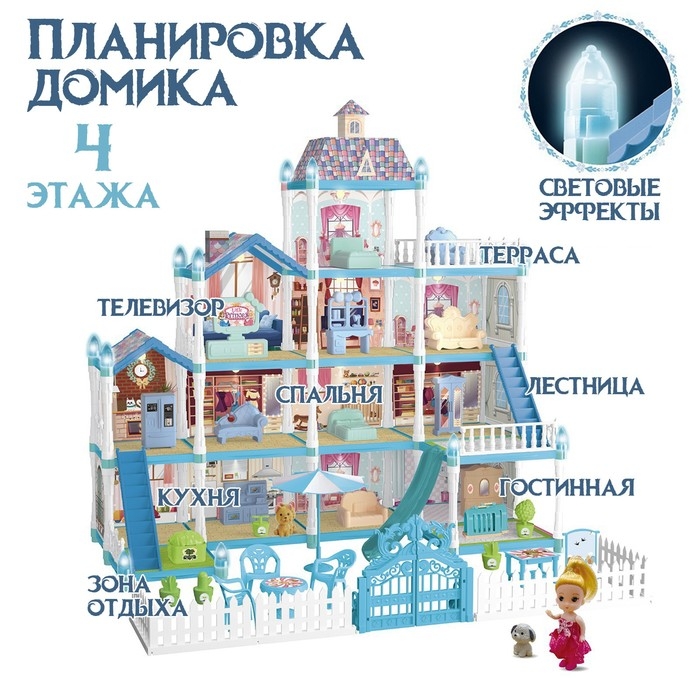 Дом для кукол «Зимний дворец» - это прекрасное место для игр и развития фантазии ребенка. Этот четыреэтажный замок окрашен в приятные белые и голубые тона, воссоздает волшебную атмосферу и предлагает множество возможностей для увлекательных сюжетов.