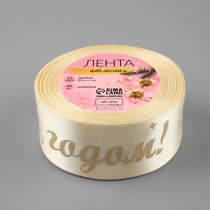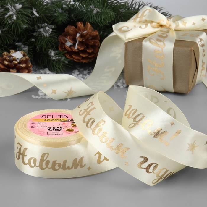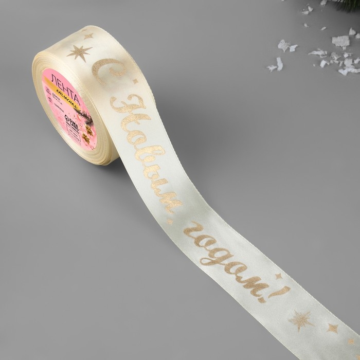 Лента атласная с тиснением «С Новым годом!», 40 мм, 23 ± 1 м, цвет бежевый/золотой №002