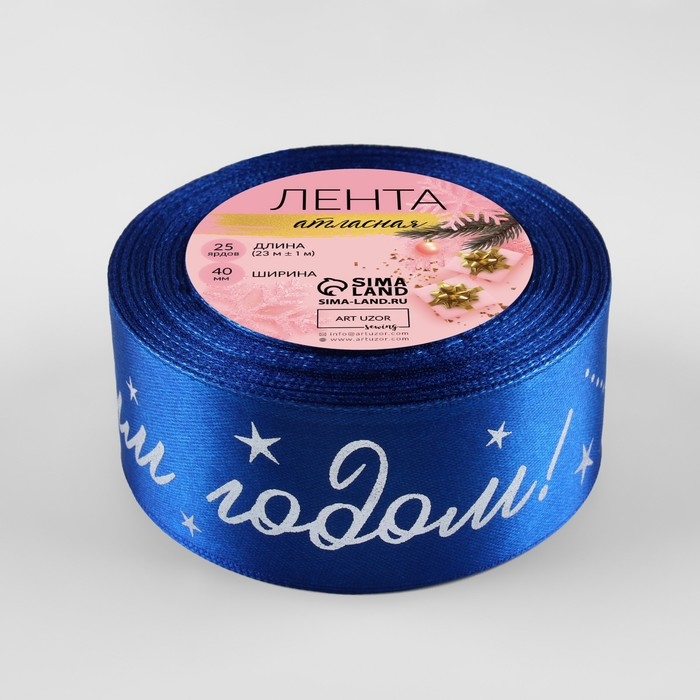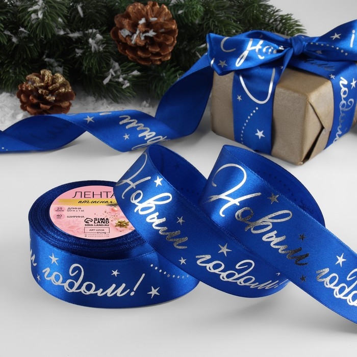 Лента атласная с тиснением «С Новым годом!», 40 мм, 23 ± 1 м, цвет синий/серебряный №122