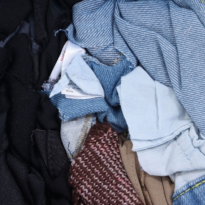 Переработанная цветная одежда секонд-хенд (джинсовые изделия, трикотажные толстовки со скатанными прошитыми прокладками, изделия с тонким синтепоном, комбинезоны, толстая спец. одежда, вельветовые изделия, толстые брюки и юбки, вязаные изделия). Лоскуты неправильной формы из толстых, плотных, грубых хлопчатобумажных и смесовых тканей.