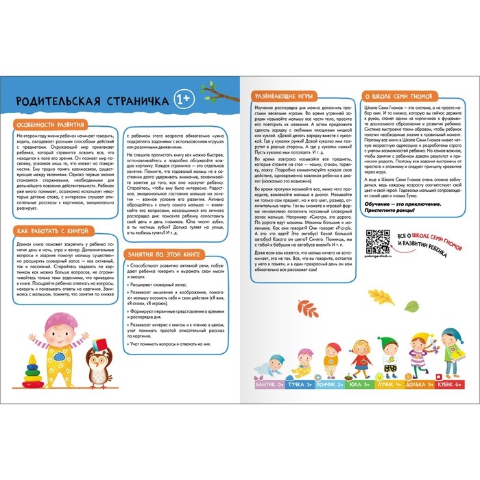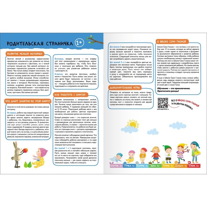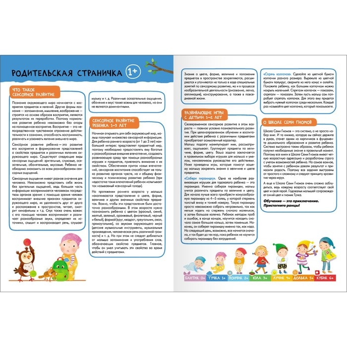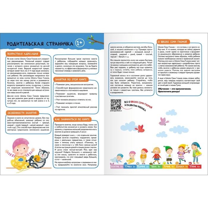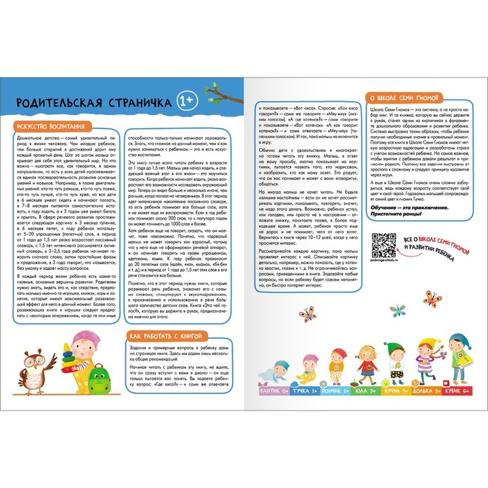 Система выстроена таким образом, чтобы ребёнок получил необходимые знания в правильный момент. Поэтому все книги в Школе Семи Гномов имеют четкую возрастную адресацию и разработаны строго с учётом возрастных возможностей ребёнка. Но самое важное, чтобы занятия с ребёнком давали результат и приносили радость. Поэтому все задания выстроены от простого к сложному и следуют принципу «развитие через игру». Заниматься с ребёнком может любой взрослый, специальных знаний и опыта не требуется. Родительская страничка в каждой книге подскажет, что, как и почему нужно развивать в данном возрасте.