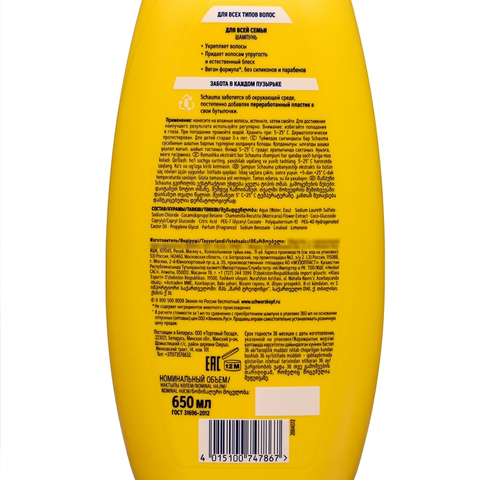 Шампунь Schauma "Для всей семьи" – идеальный выбор для заботы о волосах всей вашей семьи. Сбалансированная формула этого шампуня обеспечивает нежное очищение волос, делая их мягкими, ухоженными и приятными на ощупь. Благодаря универсальности состава, этот шампунь подходит для различных типов волос, что делает его идеальным для разнообразных потребностей членов вашей семьи. Наслаждайтесь чистотой, свежестью и заботой о волосах с каждым промыванием!