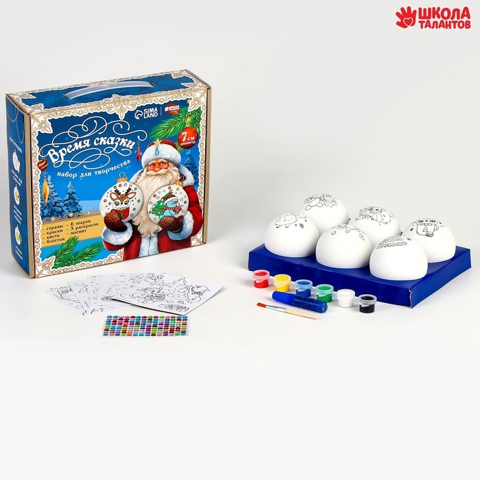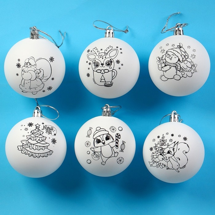 Ёлочные шары под раскраску на новый год «Время сказки», 6 шт, d = 7см, новогодний набор для творчества