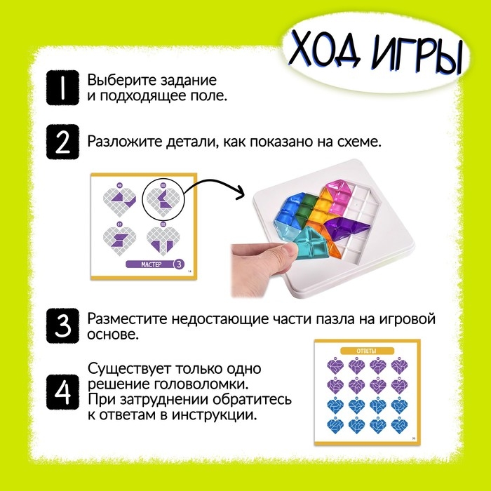 - В набор входят: игровое поле, 10 деталей, инструкция с заданиями.