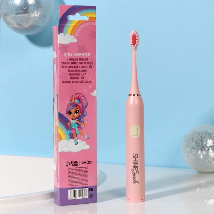 Электрическая зубная щётка предназначена для ежедневного ухода за зубами и полостью рта. Щётка нежно массирует дёсны и тщательно отчищает труднодоступные места. Чистка происходит за счёт вибрации, а не традиционного кручения головки щётки. В комплекте идут три насадки. Работает от батареек типа АА (1 шт.).