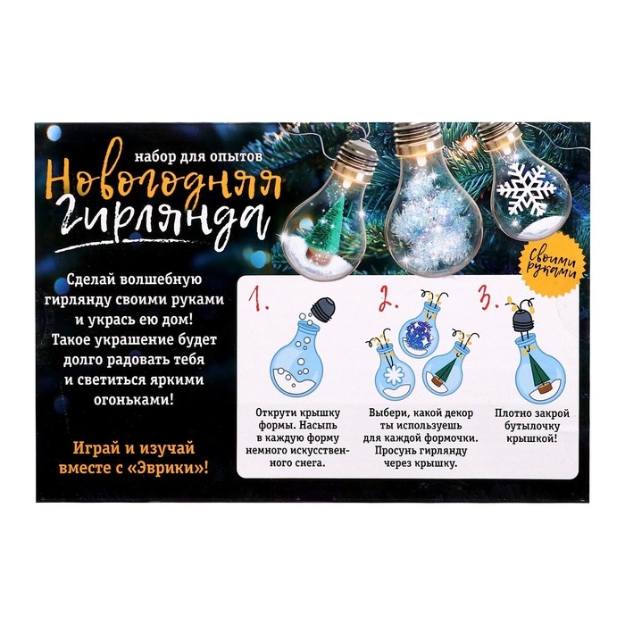 Набор для опытов «Новогодняя гирлянда» — это сочетание научного подхода и праздничного настроения. Такой подарок поможет ребёнку скрасить ожидание Нового года, а также позволит создать своё украшение. Каждая колбочка в такой гирлянде превращается в источник мерцающего света и создаёт атмосферу волшебства.