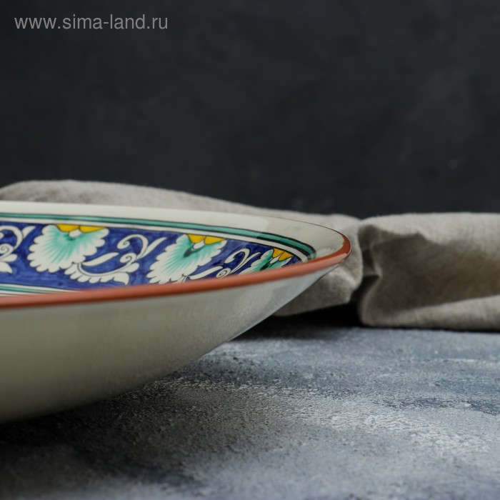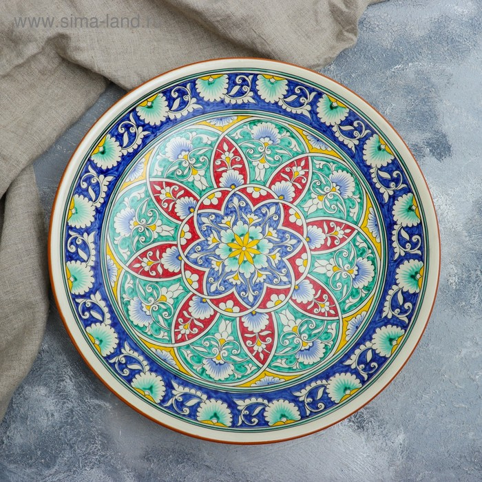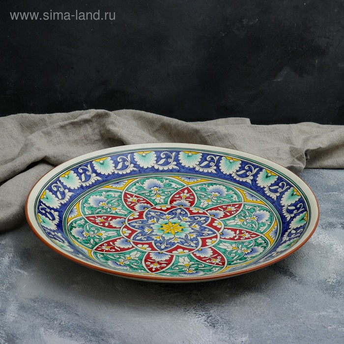 Ляган круглый Риштанская Керамика, 41см, белый с синим, красно-жёлто-зелёный узор