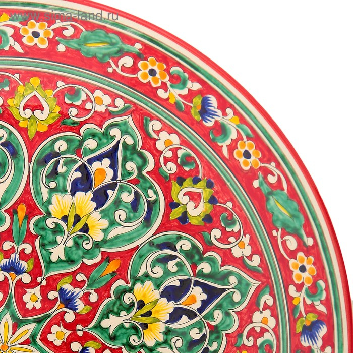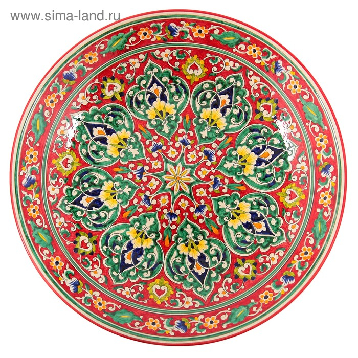 Ляган круглый Риштанская Керамика, 41см, красный, орнамент зелёно-жёлтый
