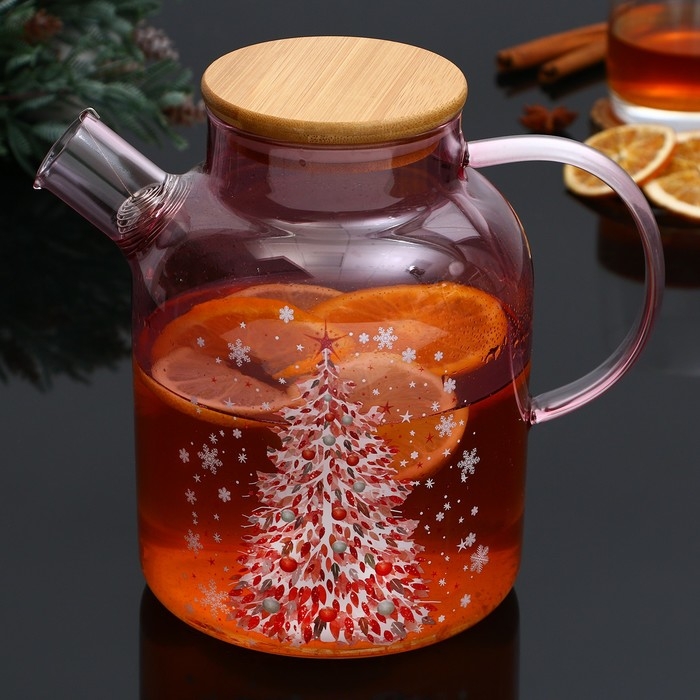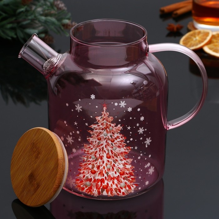 Новый год. Чайник заварочный стеклянный с бамбуковой крышкой «Розовая сказка», 1700 мл