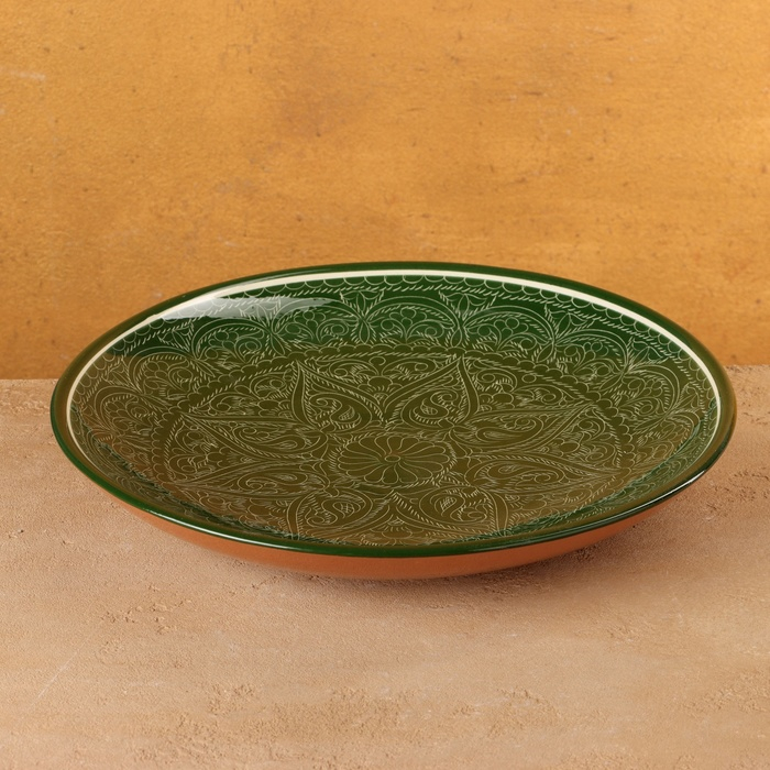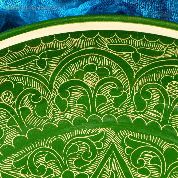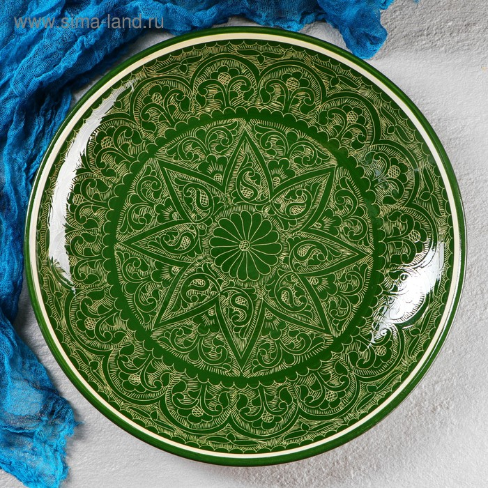 Ляган круглый, 31 см, риштанская роспись, зелёный
