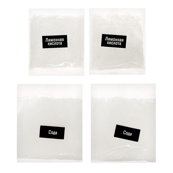 - Смешайте в стакане пакетик пищевой соды, крахмал и лимонную кислоту. Тщательно всё перемешайте, чтобы не было комочков.