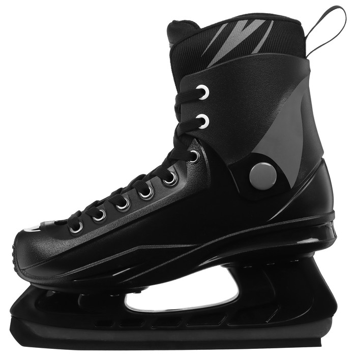- Основа ботинка: морозоустойчивый пластик. Жёсткий материал создаёт надёжную защиту от попадания шайбы. Пластиковый носок обеспечивает стойкость изделия к порезам и истиранию.