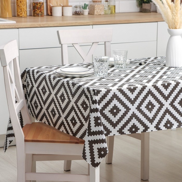 Клеёнка на нетканевой основе «Геометрия» в 3–4 раза прочнее обычных аналогов. Такой материал не мнётся и не деформируется. ПВХ-основа делает клеёнку максимально простой в уходе. Любая грязь устраняется быстро: с помощью простой влажной тряпочки вы без особых усилий приведёте стол в порядок.