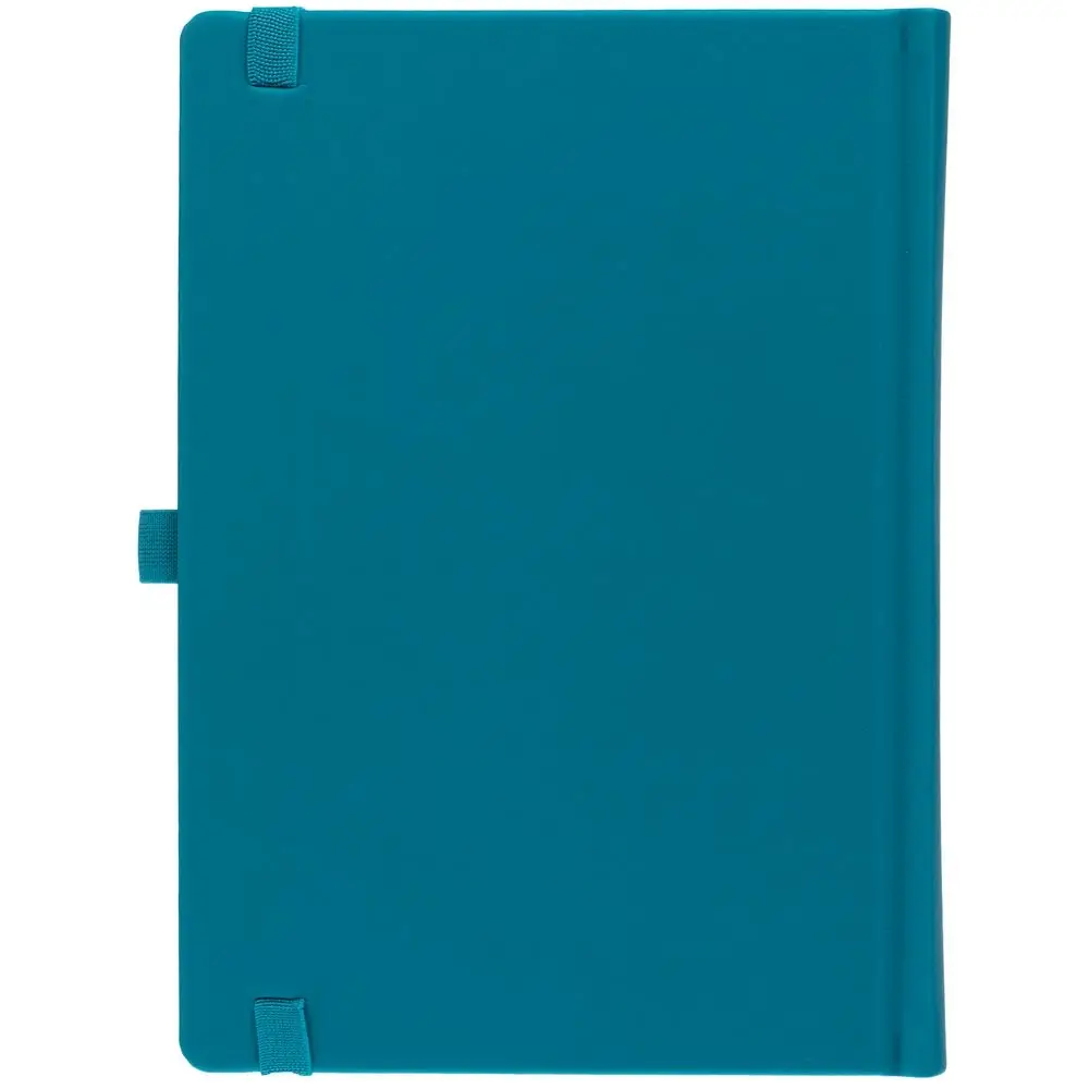 Ежедневник с твердой обложкой без поролона, выполнен из материала Soft Touch, цвет морской волны II, дополнен резинкой шириной 1 см, петлей-резинкой для ручки, капталом и ляссе темно-бирюзового цвета.