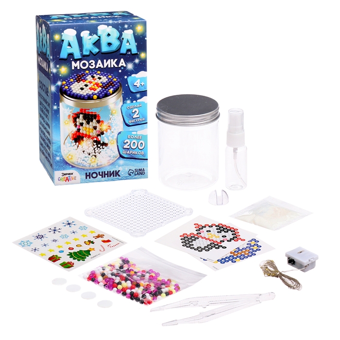 Аквамозаика «Снежная баночка» скрасит дни в ожидании Нового года и поможет весело и с пользой провести время. Ребёнок соберёт 2 объёмных фигурки из шариков-пикселей и создаст ночник своими руками.