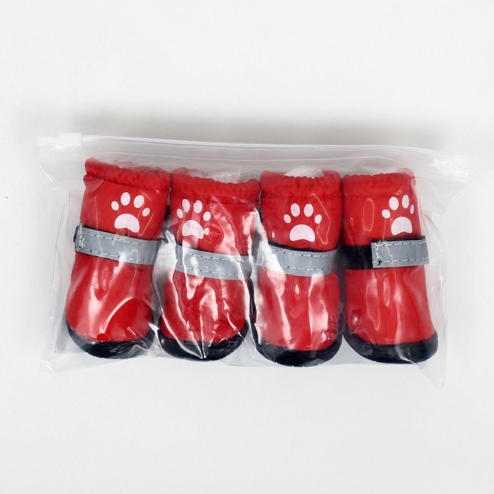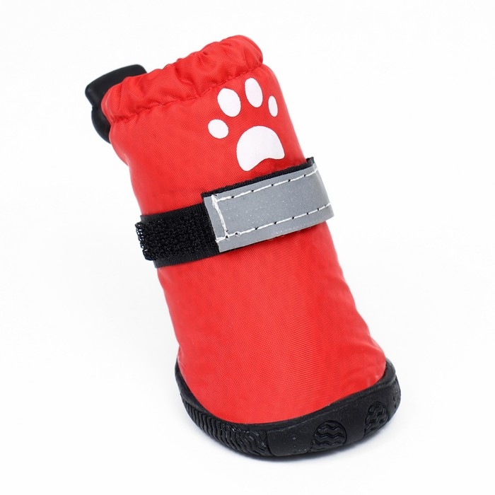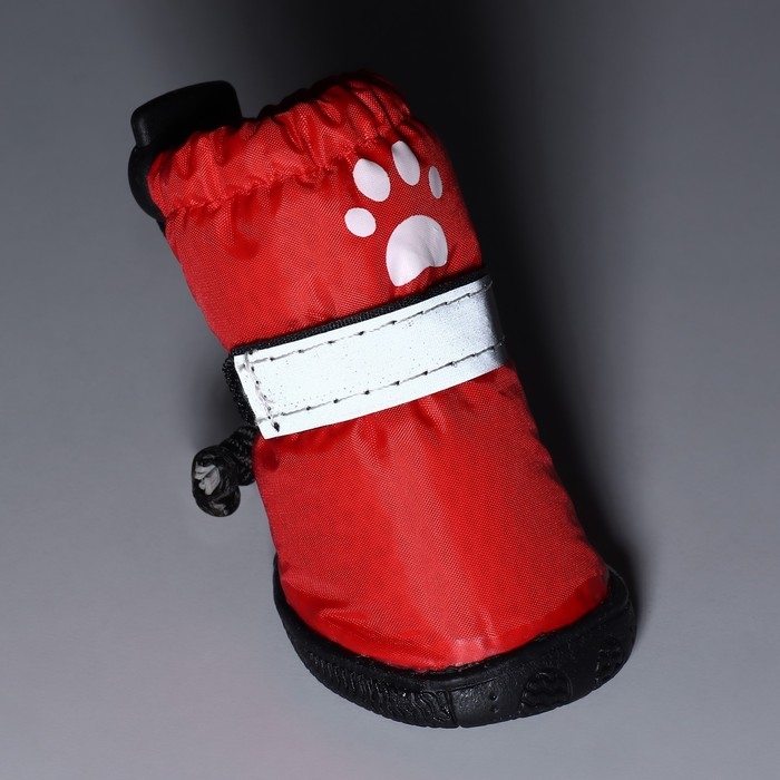 Застёжка-липучка надёжно фиксирует обувь , что позволяет легко надевать и снимать, также сверху имеется утягивающая кулиска. Для безопасности питомца липучка имеет светоотражающую ленту.